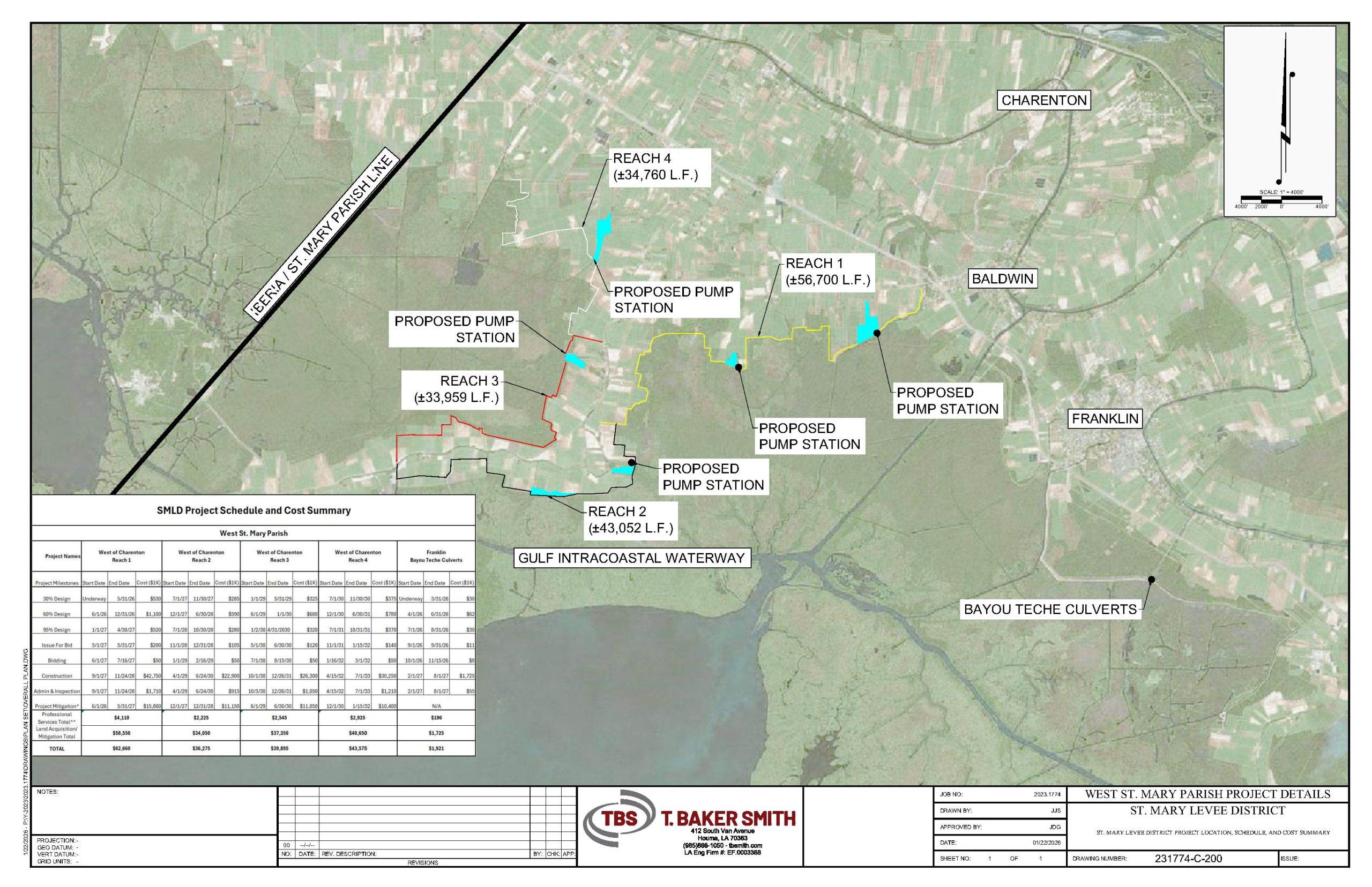 The project has been broken into 4 different reaches. Reach 1 is currently in E&D to the point of being able to start the permitting process. Reaches 2 & 3 are in the modeling phase. See the map below that shows the levee reaches and possible drainage and floodgate scenarios.